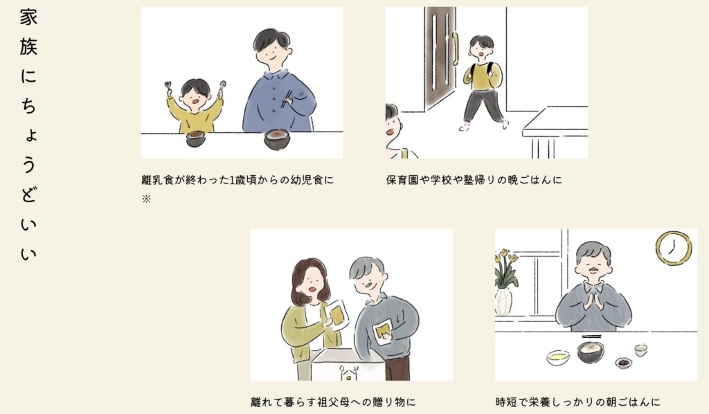 | 食卓完成までの 手間 | ・買い物不要 ・自動選択使用時メニュー選定不要 ・調理はほぼ不要(レンジで温めまたは湯煎のみ) ただし、親の分は自分で用意が必要 |