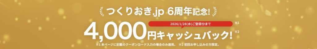 現在、つくりおき.jpではキャッシュバックキャンペーンを開催中。(1/28(水)まで)