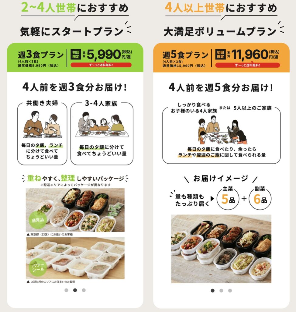 プランに迷ったら、3人家族または4人家族で子供が低学年以下の場合は週3食プランがおすすめ。