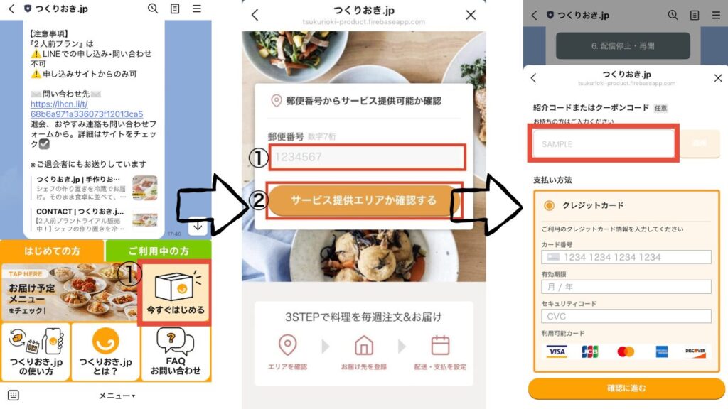 つくりおき.jp公式サイトに進み、LINE友だち登録し、クーポン欄に「RC-WELCOME6TH」を入力だけ。